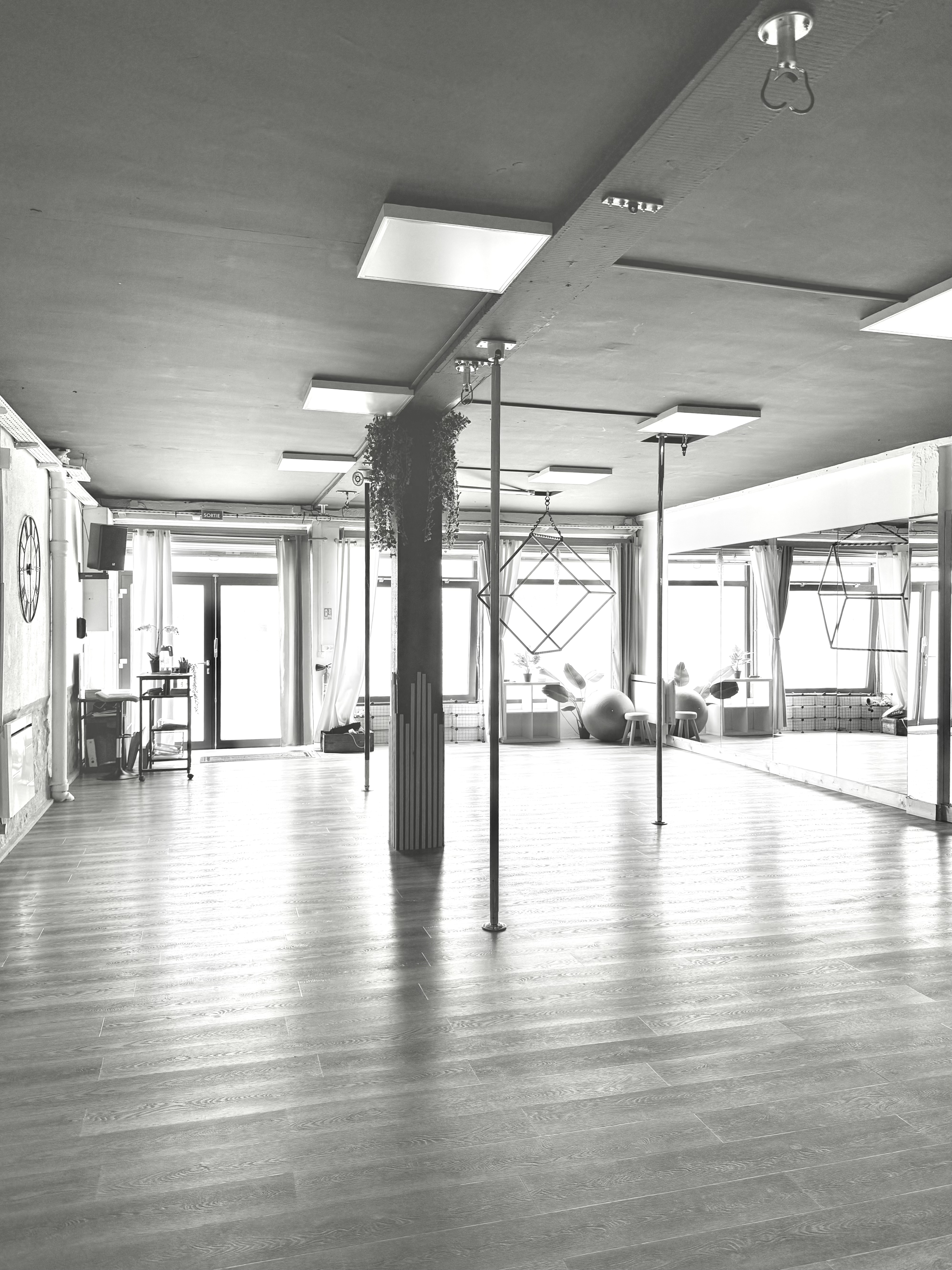 Pour votre confort, l’espace est équipé de 5 barres de pole dance, de tout le matériel nécessaire aux disciplines aérienne ( cerceau, hammock, sangle etc), ainsi que d’un vestiaire, d’un coin salon, d’une cuisine et de sanitaires.